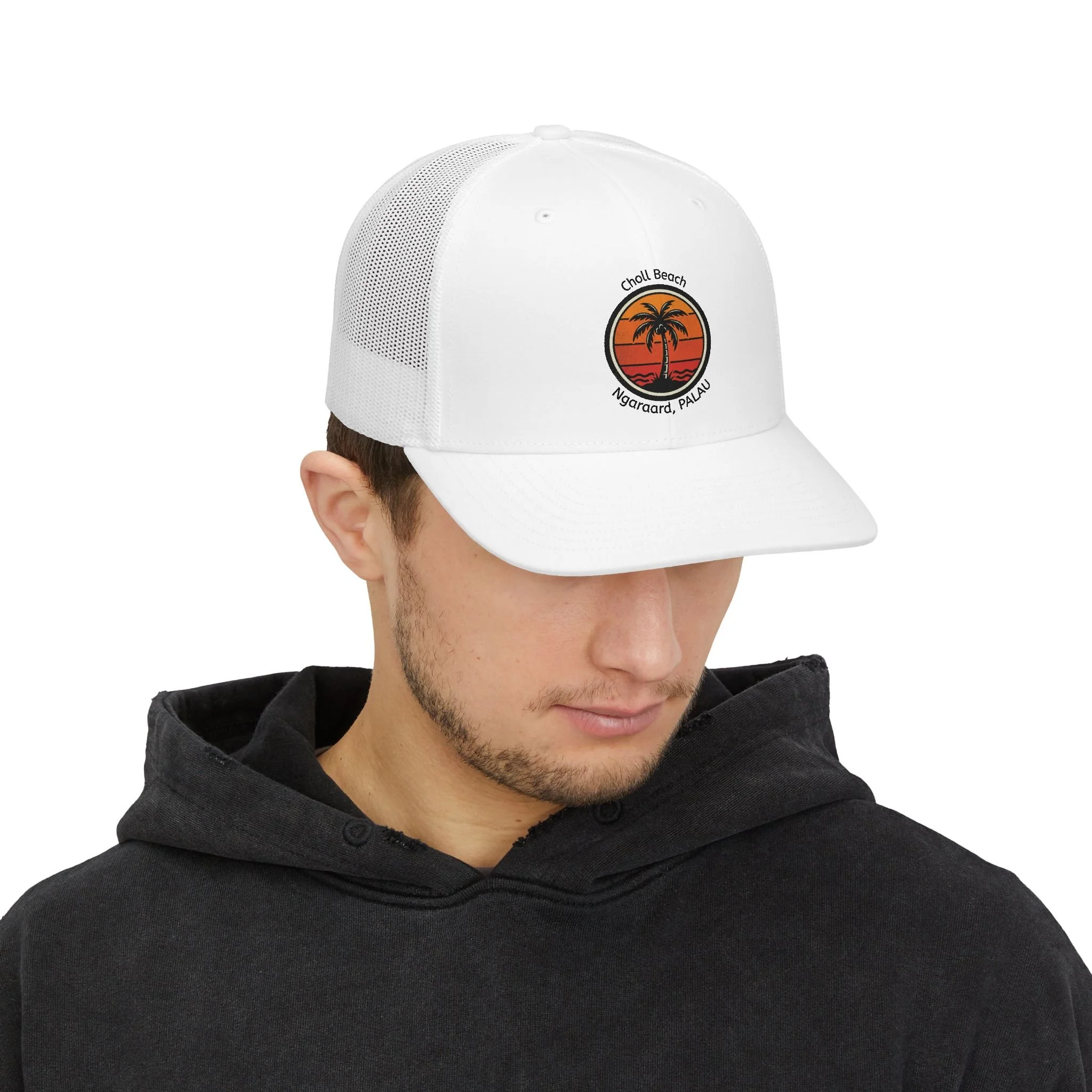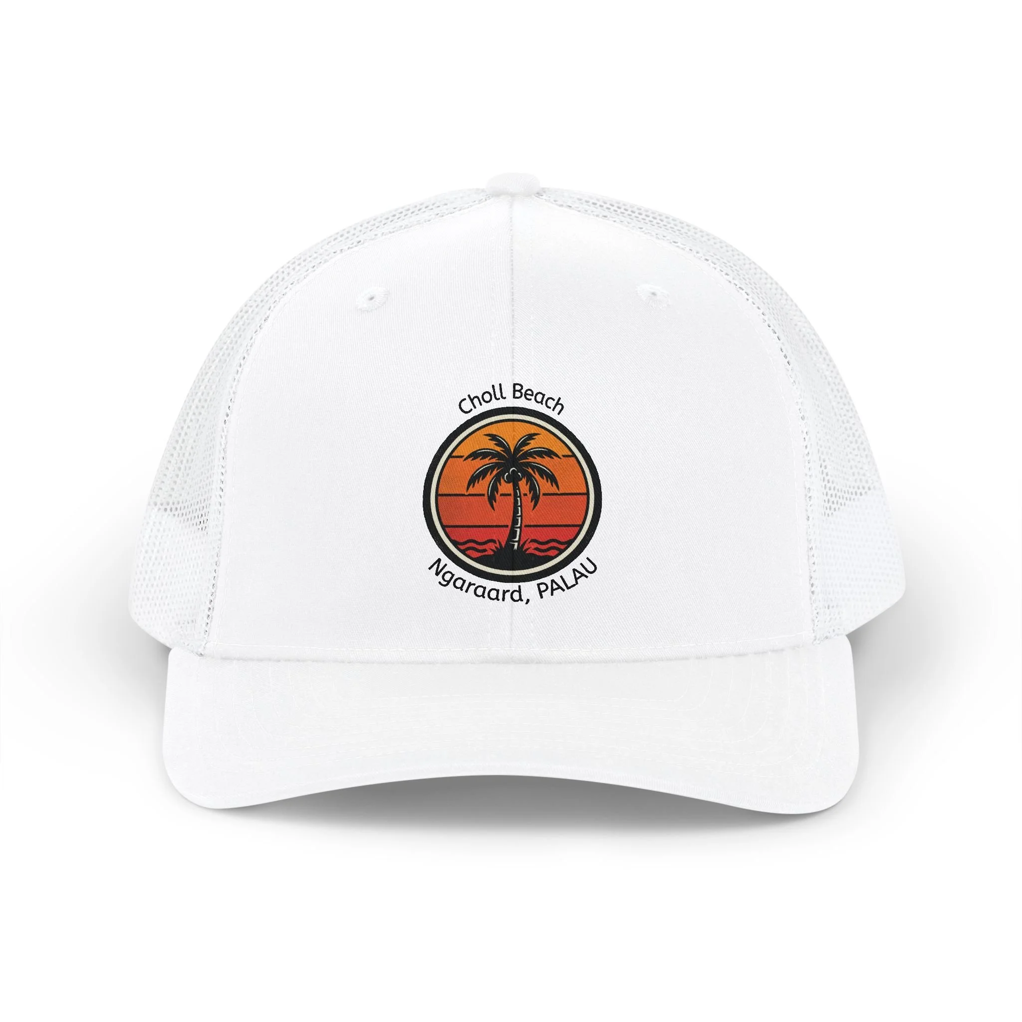 A sun-warmed trucker cap that carries a slow, ocean-side afternoon wherever you go. The structured mid-profile crown and breathable mesh back keep the fit steady and cool during long drives, beach walks, or backyard barbecues. A vintage-style sunset and palm emblem embroidered on the front adds a touched-up, well-traveled look—worn-in without being worn out. Light and airy on hot days, with a cotton sweatband to keep you comfortable. Wear it low for shade or tipped back for a breeze; it settles into whatever pace your day asks for.